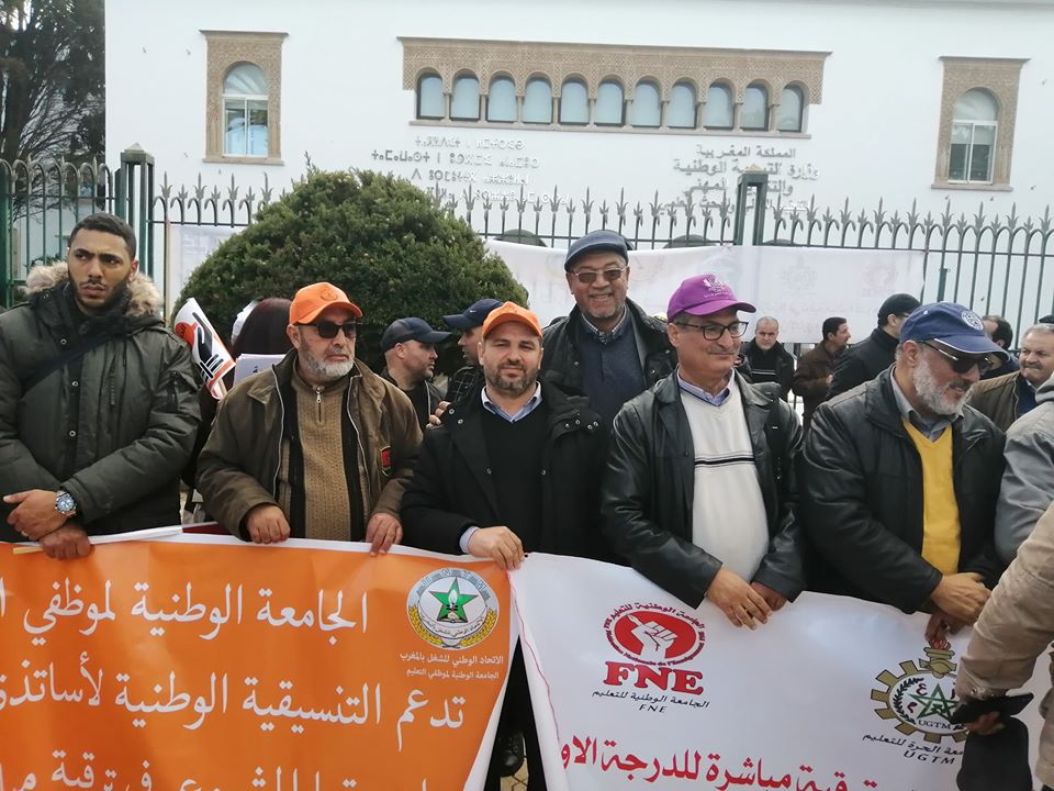 شاركت قيادة الجامعة الوطنية لموظفي التعليم المنضوية تحت الاتحاد الوطني للشغل بالمغرب الإثنين 20 يناير 2020 في الوقفة الاحتجاجية التي نظمتها التنسيقية الوطنية لموظفي وزارة التربية الوطنية المقصيين من خارج السلم، والتنسيقية الوطنية لأساتذة “الزنزانة 10″، أمام مقر الوزارة بالرباط للتنديد بتجاهل الملف المطلبي لهذه الفئة من الأسرة التعليمية.