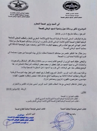 راسل المكتبان المحليان للمعهد الوطني للصحة لكل من الجامعة الوطنية لموظفي الصحة المنضوية تحت لواء الاتحاد الوطني للشغل بالمغرب، والجامعة الوطنية للصحة (umt) ، وزير الصحة للتذكير بوضعية المعهد.