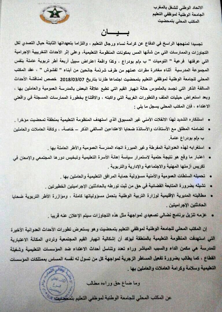 وطالب المديرية الإقليمية لوزارة التربية الوطنية بتحمل مسؤوليتها كاملة ومؤازرة الأطر التربوية ضحايا الحادثتين الإجراميتين، مؤكدا عزمه تنزيل برنامج نضالي تصعيدي لمواجهة مثل هذه التجاوزات سيتم الإعلان عنه قريبا.