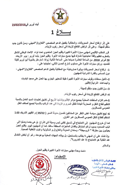 بعد احتجاج سيارات الأجرة الكبيرة يوم الأربعاء 21 فبراير 2018 بمراكش ضد غلاء اسعار المحروقات، قرر سائقو سيارات الأجرة الكبيرة بالحوز، تنظيم وقفة احتجاجية دعا لها المكتب الإقليمي لمهنيي سيارة الأجرة الكبيرة بإقليم الحوز المنضوي تحت لواء الإتحاد الوطني للشغل بالمغرب، الأربعاء 28 فبراير 2018، أمام مقر باشوية أيت أورير قابلة للتمديد.