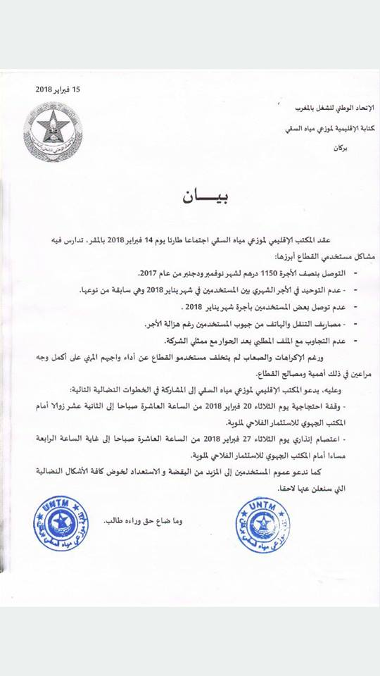 دعا المكتب الإقليمي لموزعي مياه السقي ببركان المنضوي تحت لواء الاتحاد الوطني للشغل بالمغرب، المستخدمين إلى المزيد من اليقظة، والمشاركة في الوقفة الاحتجاجية المزمع تنظيمها يوم الثلاثاء 20 فبراير 2018 من الساعة العاشرة صباحا إلى الثانية عشر زوالا أمام المكتب الجهوي للاستثمار الفلاحي لملوية.