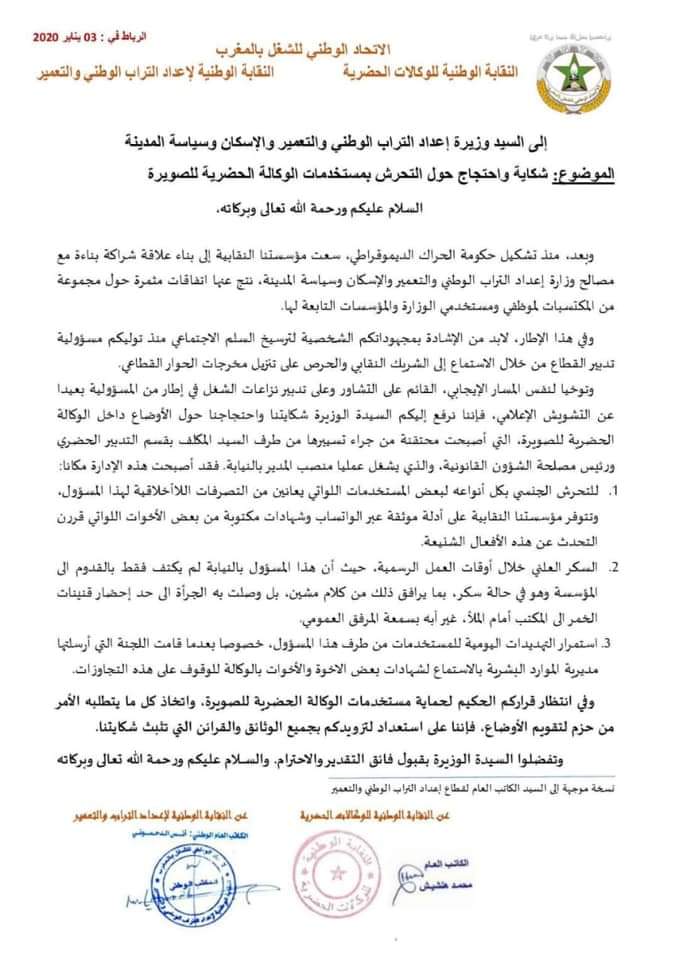 واحتجت النقابتان في شكوى مقدمة إلى وزيرة إعداد التراب الوطني والتعمير والإسكان وسياسة المدينة، على احتقان الأوضاع جراء تسييرها من طرف المكلف بقسم التدبير الحضري ورئيس مصلحة الشؤون القانونية، والذي يشغل عمليا منصب المدير بالنيابة.