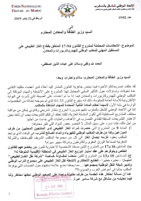 راسلت نقابة عمال ومستخدمي المكتب الوطني للهيدروكاربورات والمعادن المنضوية تحت لواء الاتحاد الوطني للشغل بالمغرب، وزير الطاقة والمعادن، للإجابة عن مجموعة من الأسئلة المتعلقة بالانعكاسات المحتملة لمشروع القانون 94-17 المتعلق بقطاع الغاز الطبيعي على المستقبل المهني للمكتب.