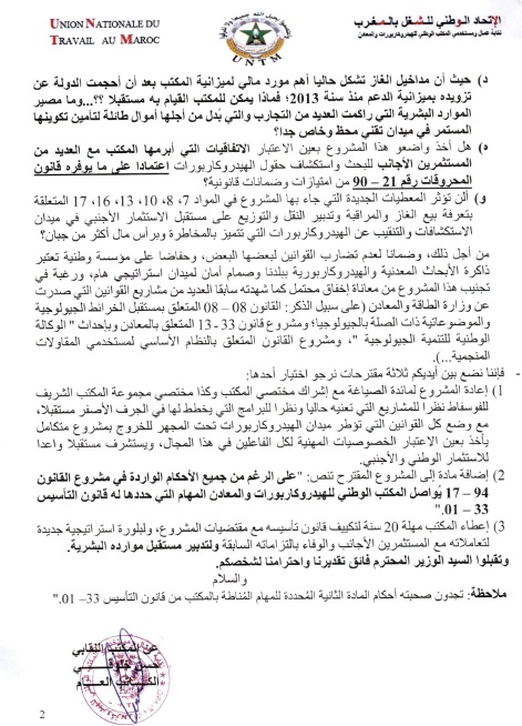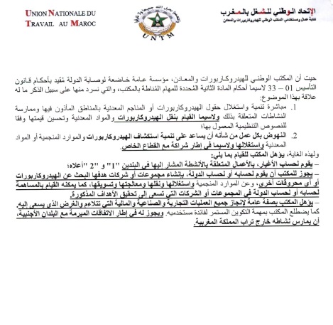 واكدت النقابة في المراسلة أن تصريحات الوزير الأخيرة فيما يخص جاهزية القانون المشار إليه أعلاه خلفت لدى أعضاء المكتب النقابي عدة تخوفات وتساؤلات حول التأثير السلبي المحتمل لهذا المشروع على الأنشطة والمهام الموكلة إلى المكتب الوطني للهيدروكاربورات والمعادن،إذا ما تم اعتماده على الصيغة التي نٌشرت في البوابة الإلكترونية للأمانة العامة للحكومة، مشيرة إلى أنه سيُفرغ القانون 33-01 الذي تم بموجبه إحداثه من المقتضيات الواردة في بابه الأول لاسيما أحكام المادة الثانية المُحددة للمهام المُناطة بالمكتب.