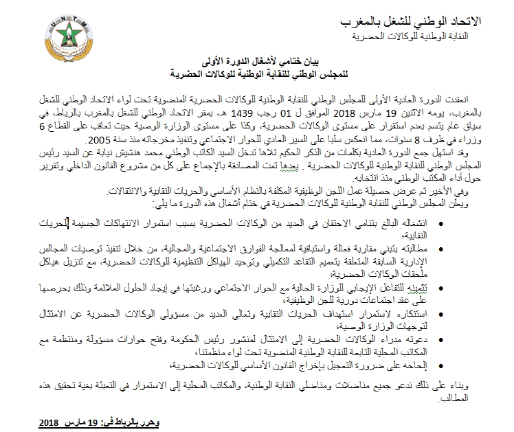 ودعا المجلس في بلاغ له عقب انعقاد دورته العادية الإثنين 19 مارس 2018، بالمقر المركزي للاتحاد بالرباط، مدراء الوكالات الحضرية إلى الامتثال لمنشور رئيس الحكومة وفتح حوارات مسؤولة ومنتظمة مع المكاتب المحلية التابعة للنقابة الوطنية المنضوية تحت لواء منظمتنا، معلنا تثمينه للتفاعل الإيجابي للوزارة الحالية مع الحوار الاجتماعي ورغبتها في إيجاد الحلول الملائمة وذلك بحرصها على عقد اجتماعات دورية للجن الوظيفية.