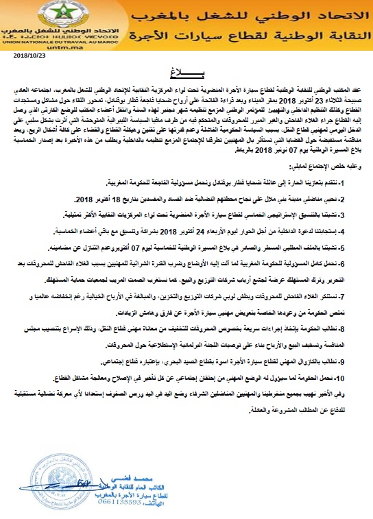وأكدت النقابة استجابتها لدعوة الداخلية من أجل الحوار يوم الأربعاء 24 أكتوبر 2018 بشراكة مع باقي أعضاء الخماسية، مؤكدة تشبثها بالتنسيق الاستراتيجي الخماسي لقطاع سيارة الأجرة المنضوية تحت لواء المركزيات النقابية الأكثر تمثيلية، وبالملف المطلبي المسطر والصادر في بلاغ المسيرة الوطنية للخماسية ليوم 7 أكتوبر وعدم التنازل عن مضامينه.