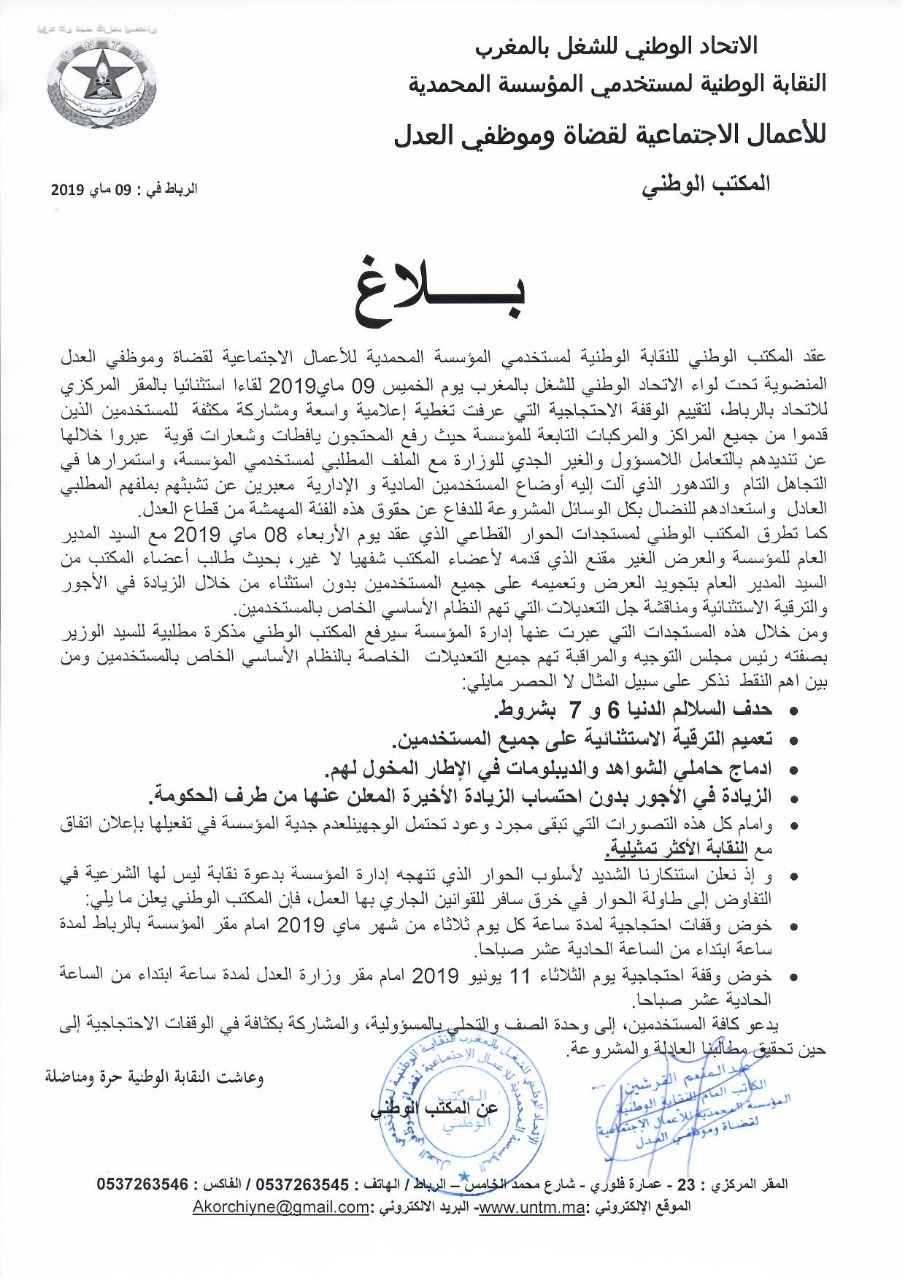 ونددت النقابة خلال الاجتماع الاستثنائي لمكتبها الوطني الخميس 9 ماي 2019، بالتعامل اللامسؤول وغير الجدي للوزارة مع الملف المطلبي لمستخدمي المؤسسة، واستمرارها في التجاهل التام والتدهور الذي آلت إليه أوضاع المستخدمين المادية و الإدارية، مؤكدة خوضها لوقفات احتجاجية لمدة ساعة كل يوم ثلاثاء من شهر ماي 2019 أمام مقر المؤسسة بالرباط لمدة ساعة ابتداء من الساعة الحادية عشر صباحا، وخوض وقفة احتجاجية يوم الثلاثاء 11 يونيو 2019 أمام مقر وزارة العدل لمدة ساعة ابتداء من الساعة الحادية عشر صباحا.