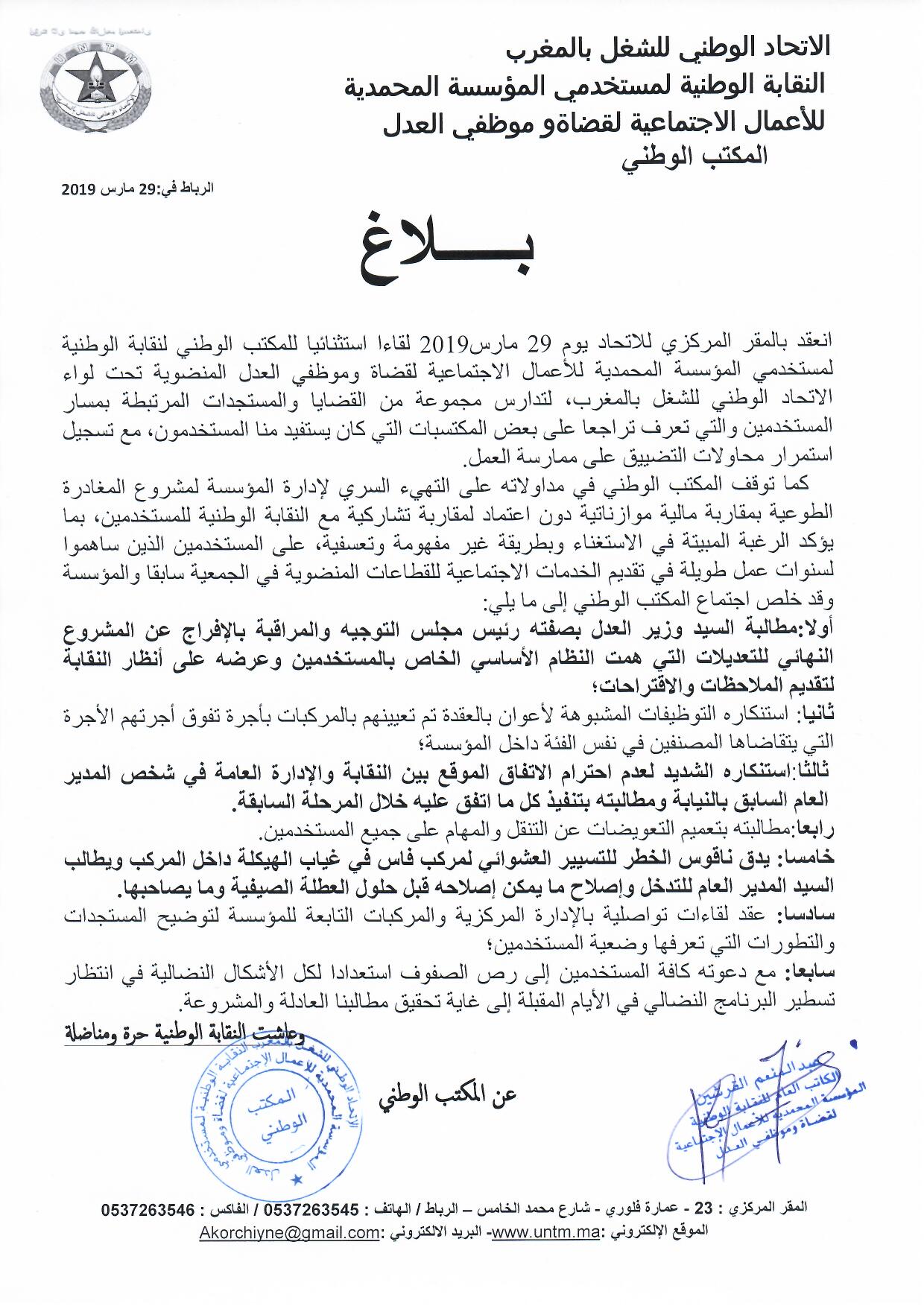 كما طالبت بعقد لقاءات تواصلية بالإدارة المركزية والمركبات التابعة للمؤسسة لتوضيح المستجدات والتطورات التي تعرفها وضعية المستخدمين، داعية كافة المستخدمين إلى رص الصفوف استعدادا لكل الأشكال النضالية في انتظار تسطير البرنامج النضالي في الأيام المقبلة إلى غاية تحقيق مطالبنا العادلة والمشروعة.