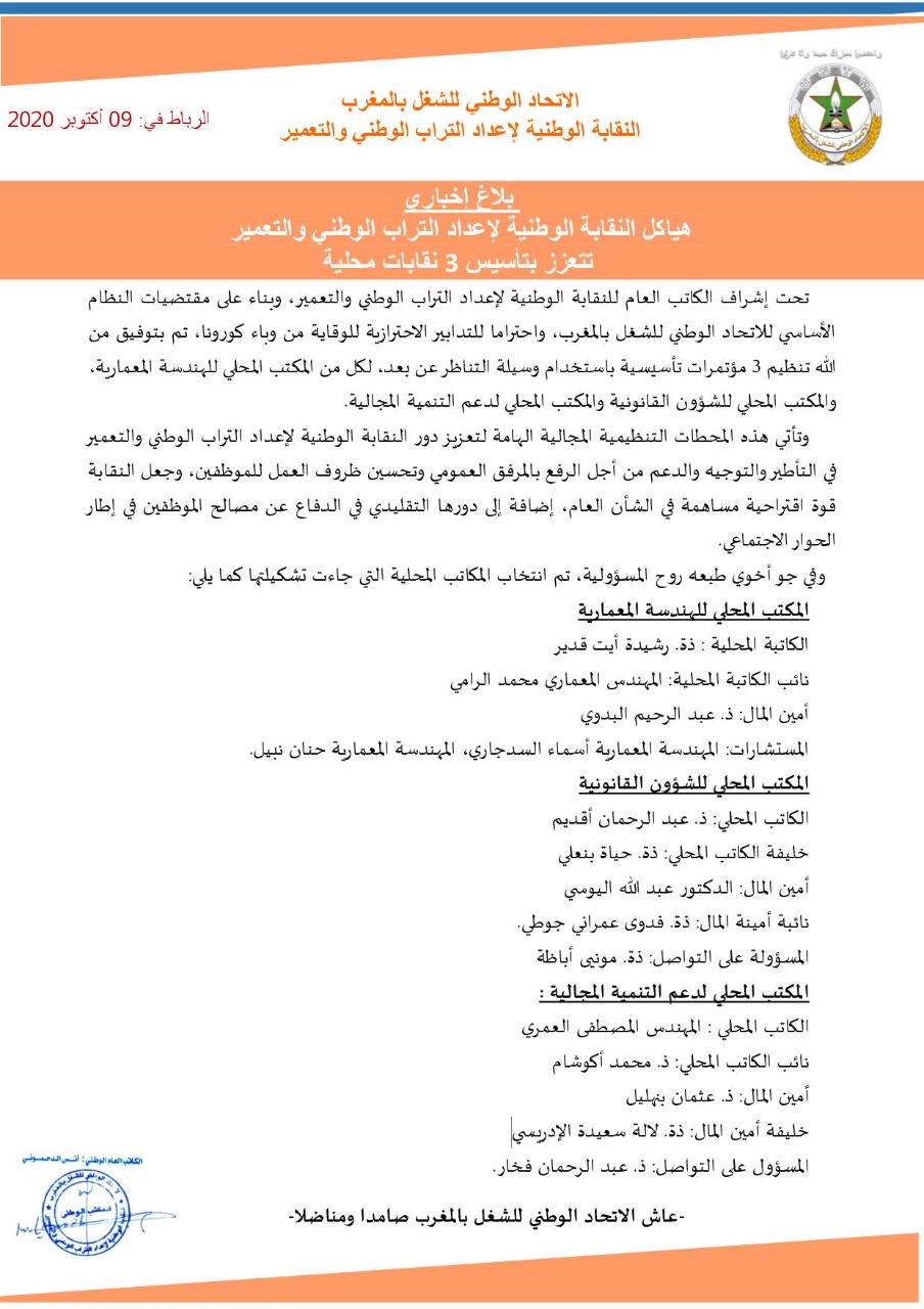 تحت إشراف الكاتب العام للنقابة الوطنية لإعداد التراب الوطني والتعمير، وبناء على مقتضيات النظام الأساسي للاتحاد الوطني للشغل بالمغرب، واحتراما للتدابير الاحترازية للوقاية من وباء كورونا، تم تنظيم 3 مؤتمرات تأسيسية باستخدام وسيلة التناظر عن بعد، لكل من المكتب المحلي للهندسة المعمارية، والمكتب المحلي للشؤون القانونية والمكتب المحلي لدعم التنمية المجالية.