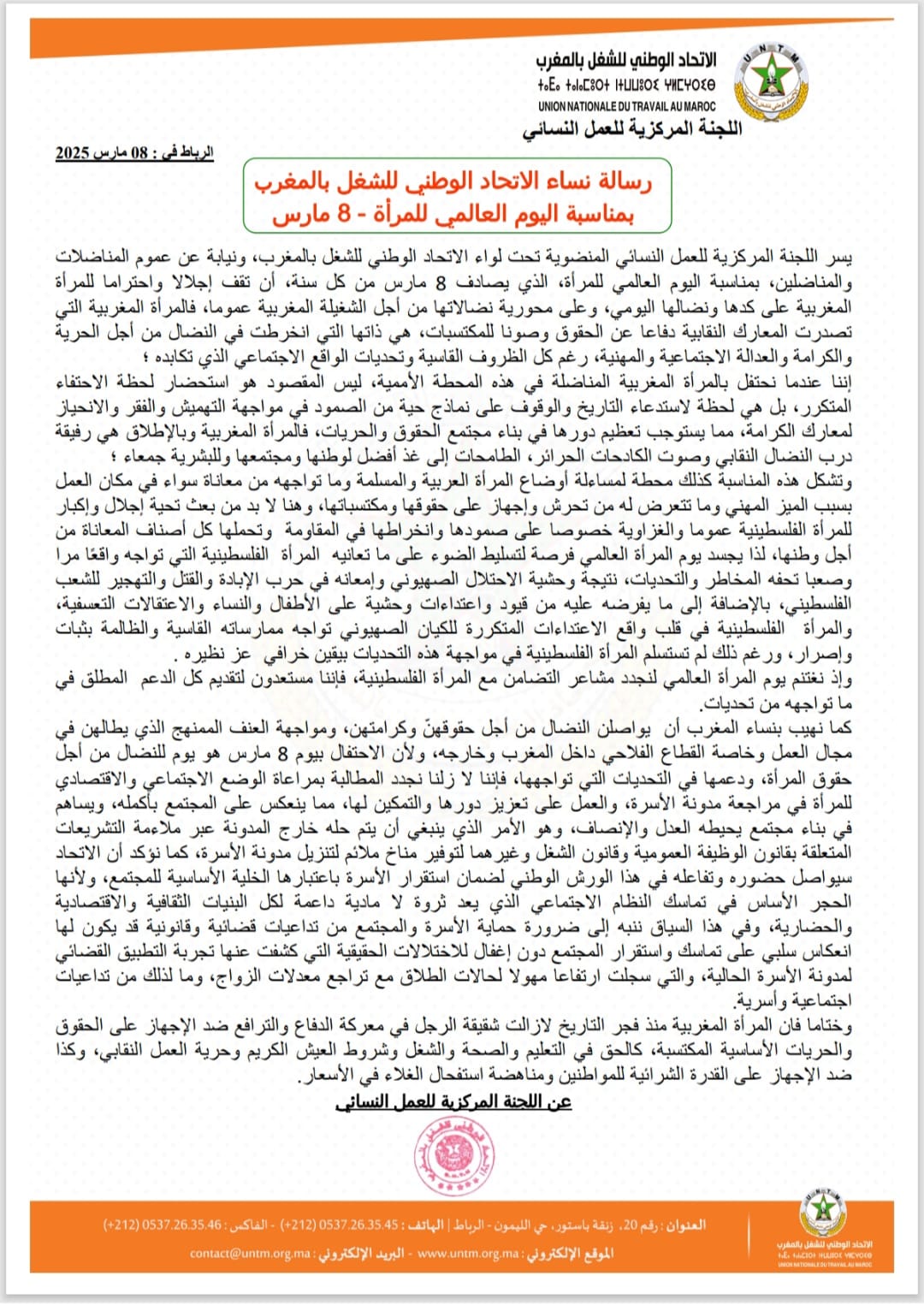 رسالة نساء الاتحاد الوطني للشغل بالمغرب بمناسبة اليوم العالمي للمرأة – 8 مارس