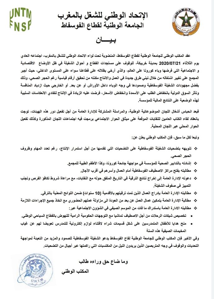 وطالبت الجامعة خلال انعقاد مكتبها الوطني يوم الثلاثاء 21 يوليوز 2020 بمدينة خريبكة، بفتح مراكز الاصطياف الفوسفاطية أمام العمال وأسرهم في أقرب الآجال، كما دعت الإدارة العامة إلى إخراج نتائج الترقية في التاريخ المتفق حوله مع النقابات، مع مراعاة شروط تكافؤ الفرص وتجنب التمييز في صفوف الشغيلة.