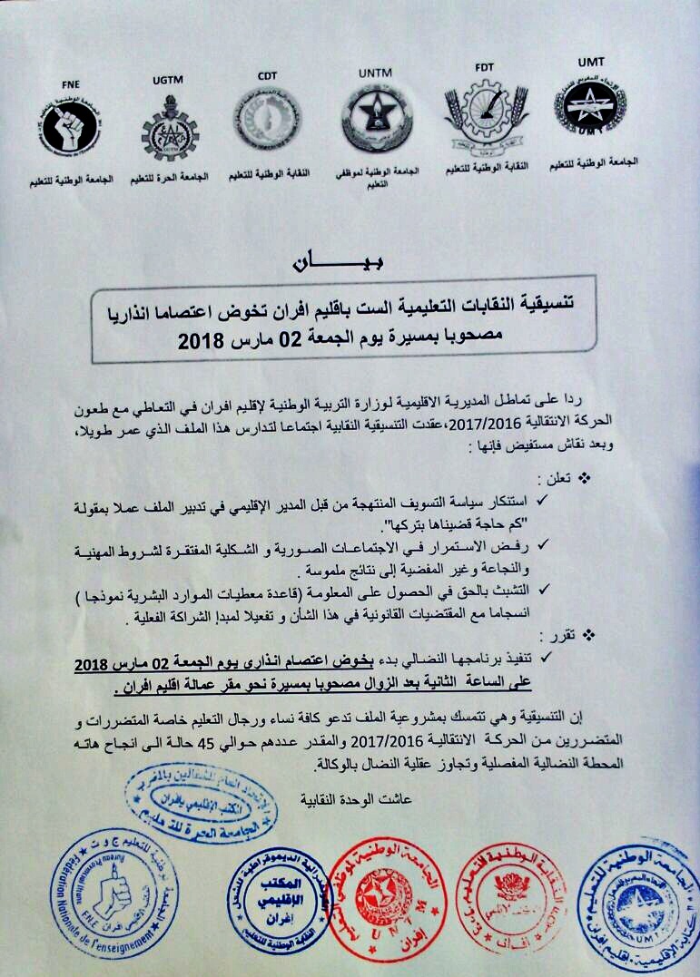 دعت تنسيقية النقابات التعليمية الست بإقليم إفران التي تضم المكتب الإقليمي للجامعة الوطنية لموظفي التعليم المنضوية تحت لواء الاتحاد الوطني للشغل بالمغرب، وخمس نقابات أخرى، كافة نساء ورجال التعليم خاصة المتضررات والمتضررين من الحركة الانتقالية 2016/2017، والمقدر عددهم بحوالي 45 حالة إلى المشاركة في الاعتصام الإنذاري الذي ستخوضه التنسيقية يوم الجمعة 2 مارس 2018، على الساعة الثانية بعد الزوال، مصحوبا بمسيرة نحو مقر عمالة إفران.