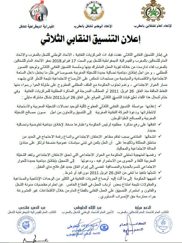 وأعلن التنسيق النقابي الثلاثي في بلاغ له، عقب اللقاء الذي جمع قيادات المركزيات النقابية الثلاث، يوم السبت 17 فبراير2018 بمقر الاتحاد العام للشغالين بالمغرب، عن الاتفاق على رفع مذكرة مطلبيه لرئيس الحكومة واعتبارها مدخلا لإطلاق دينامية تفاوضية ونضالية جديدة.